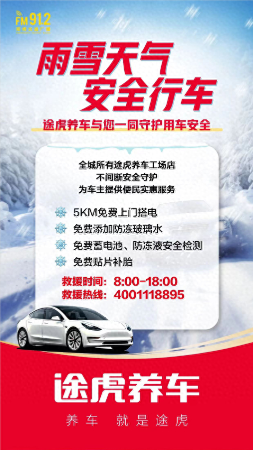 为守护当地车主安全出行,途虎养车于12月13日宣布成立紧急救援服务队。途虎养车紧急救援服务的对象,为郑州市内的居民车辆和非营运车辆。免费服务内容包含途虎养车工场店5公里内免费上门搭电(8-18点),免费添加防冻玻璃水,免费蓄电池、防冻液安全检测,免费贴片补胎4大项。