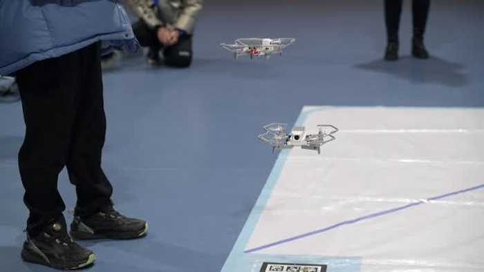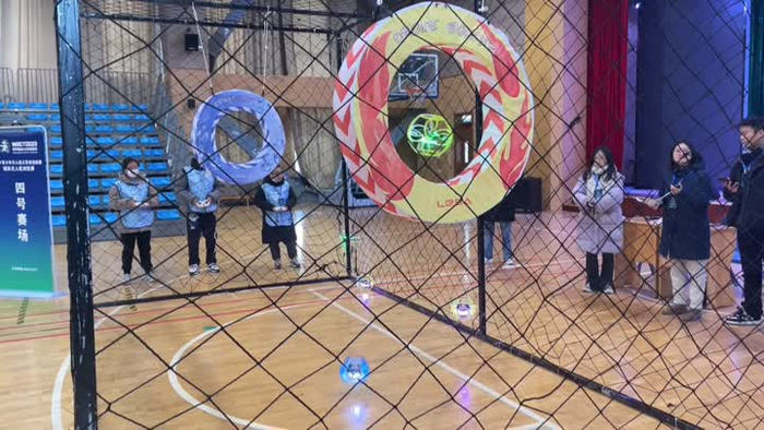 球形无人机对抗赛紧张刺激。三个人一队,有点像踢足球,他们操控“无人机足球”,如果通过对方的圆形“球门”就能得分。这个“小球场”里,六架无人机左突右穿,上上下下,操控的学生速度飞快,要做到手脑并用。