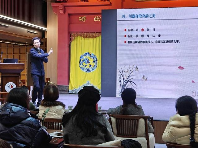 讲座中,肖德美还结合川剧《情探》《摘红梅》《死水微澜》等经典台词,讲述川剧“剧本的文字性强,语言风趣、幽默;表演程式功法丰富、川剧表演雅俗共赏”等特点。讲到川剧唱腔之美时,他还教现场观众学唱昆腔、高腔等,并分享了川剧帮腔、打击乐的重要作用。