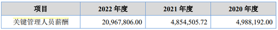 2020至2022年,公司关键管理人员薪酬分别为498.82万元、485.45万元和2096.78万元。2022年公司关键管理人员薪酬同比大幅增长,增长率为332%。公司表示:2022年经营业绩大幅增长,触发了核心团队激励管理办法,当年计提了1144.40万元的奖金。
