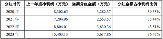 2020年至今,发行人共进行了4次现金分红,分红金额分别为3,282.37万元、2,553.57万元、3,830.36万元和5,617.86万元,合计分红金额达1.53亿元。