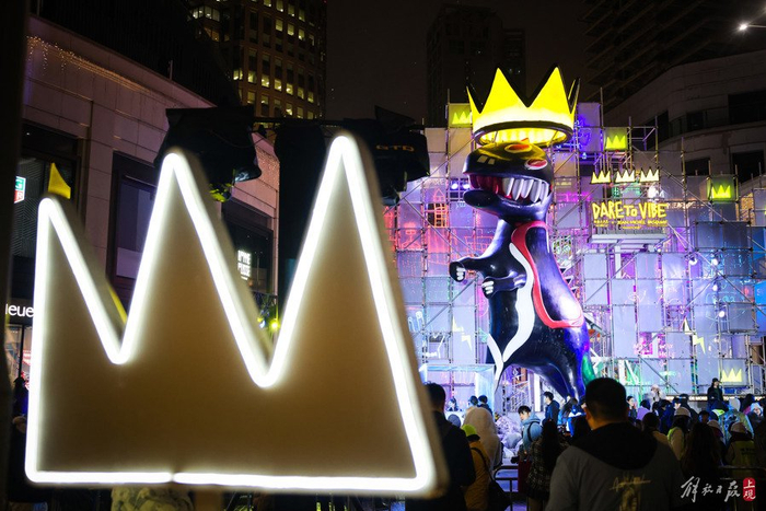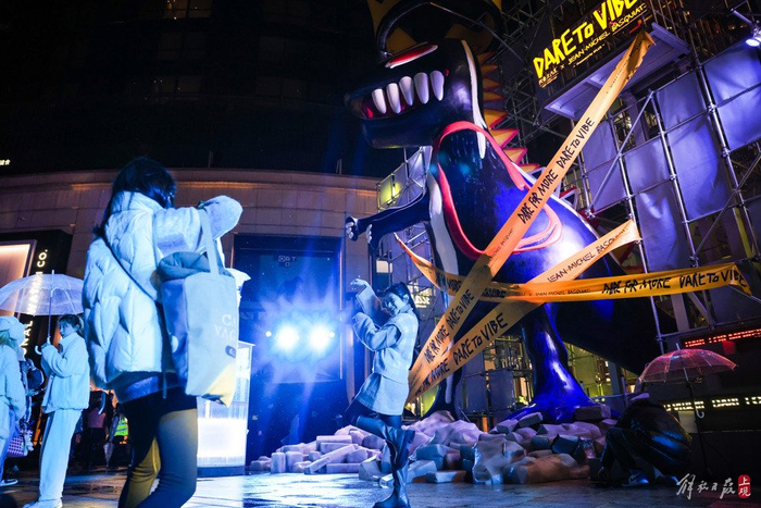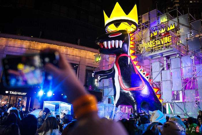 在“小恐龙”周围,35幅巴斯奎特经典作品以霓虹灯光艺术的形式亮相,呈现光影流动的艺术空间,塑造充满鲜活色彩的繁华都市氛围。