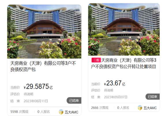 据介绍,截至处置基准日2023年4月30日,3户债权资产包债权本息总额合计约为人民币29.59亿元,其中本金余额21.46亿元。抵押物为天津丽思卡尔顿酒店、三亚洲际酒店、光合谷温泉酒店。