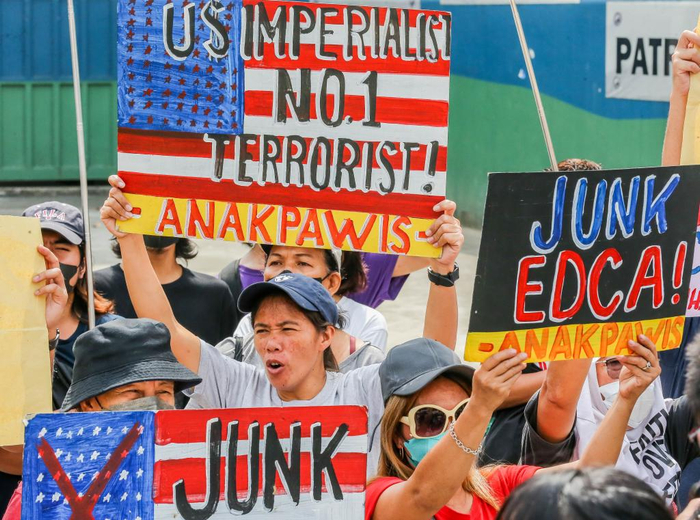 2023年4月11日,在菲律宾首都大马尼拉地区奎松城,民众参加集会活动,抗议菲律宾和美国军方举行联合军事演习。菲律宾和美国军方当天在菲首都马尼拉启动为期18天的2023年度“肩并肩”联合军事演习。新华社发(乌马利摄)