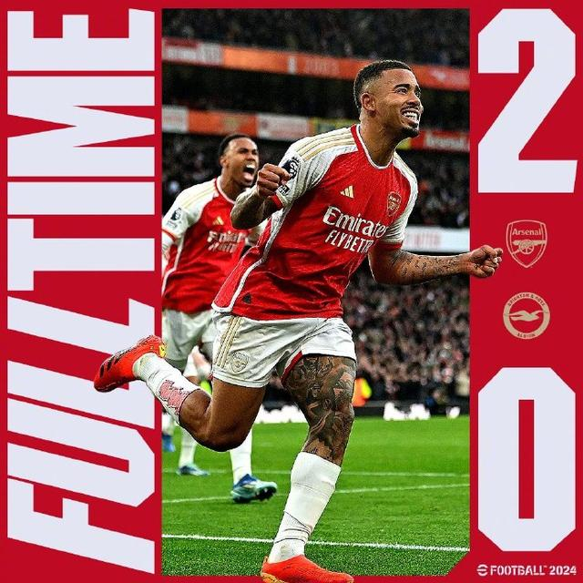 在英超第17轮另一场比赛中,阿森纳主场2比0完胜布莱顿,热苏斯和哈弗茨各进一球。