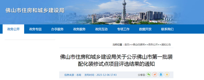 佛山市住房和城乡建设局关于公示佛山市第一批装配化装修试点项目评选结果的通知