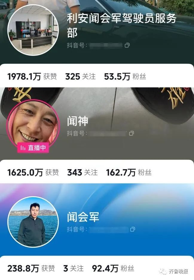 记者搜索发现,照片中的男子名叫闻会军,70后,资料显示他是一名来自河北的驾校教练。但神奇之处是,闻会军有三个账号,一个叫利安闻,一个叫闻会军,一个叫闻神,加起来仅在抖音一个平台的粉丝量就有300多万。