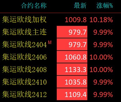 受上述消息影响,12月18日,文华财经数据显示,集运指数(欧线)期货EC主力2404合约开盘涨停,之后短暂打开涨停板,临近10点时再次封住涨停至午间收盘。截至午间收盘,集运指数(欧线)期货各期限合约全线涨停。