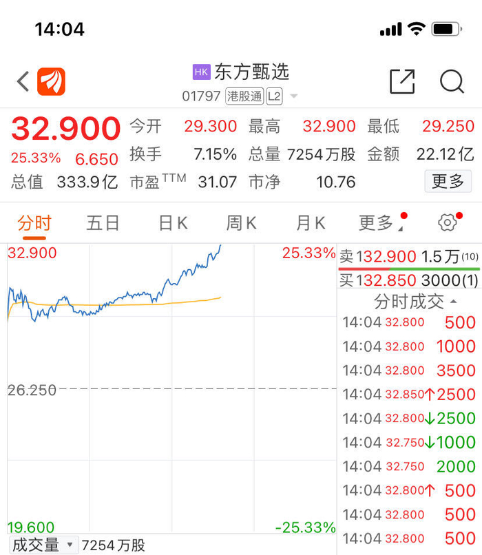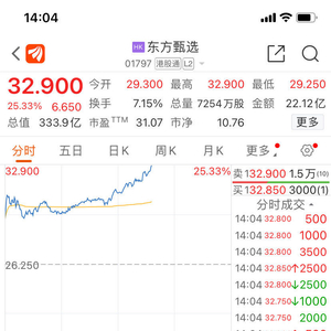 近期股价持续承压的东方甄选,今天上午大幅反弹,一度涨逾18%。12月18日午后,港股东方甄选涨幅扩大至20%。截至发稿,东方甄选大涨超25%,暂报32.9港元。