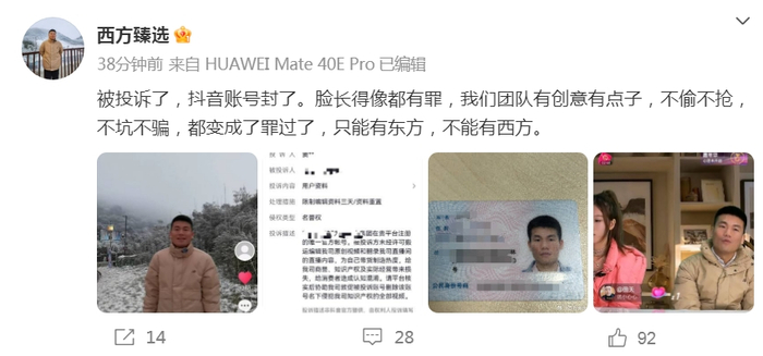 12月18日,有网友发现,抖音平台出现名为“西方甄选”的短视频账号,被网友称为“东方甄选高仿号”。目前抖音平台已经无法搜索到“西方甄选”账号,但目前仍可看到“西方的甄选”“西方甄选好物”等类似账号名称。据澎湃新闻消息,对于“西方甄选”的账号,抖音相关负责人表示,账号涉及仿冒假冒,不当蹭热,平台已将账号封禁,收回直播权限,抹除不当获取粉丝,取消其营利权限。