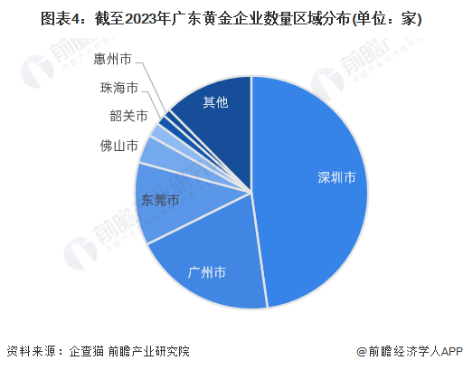 地区分布方面,目前广东黄金企业主要分布在深圳和广州等地,截至2023年12月7日,深圳共有相关黄金企业数48493家,广州则有20183家。