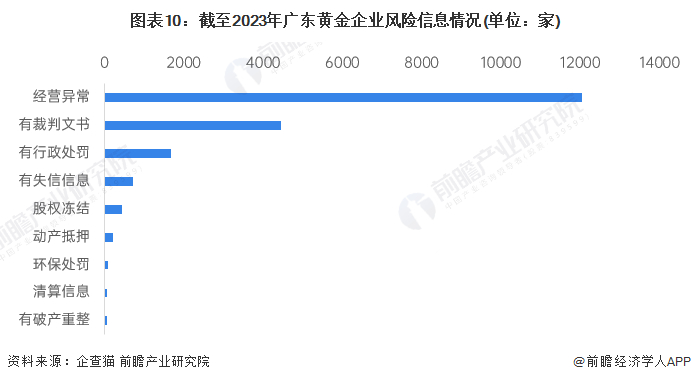 从风险角度来看,在存续/在业的黄金企业中,12030家企业存在经营异常,4443家企业有裁判文书,1685家企业有行政处罚。