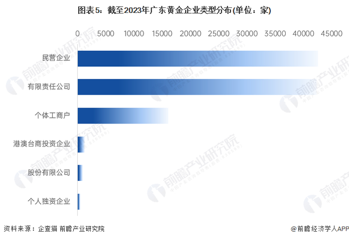 根据中国企业数据库企查猫,目前广东省存续和在业的黄金企业共60881家,广东省黄金企业以民营企业为主,目前共有42561家,其次为有限责任公司的42359家。
