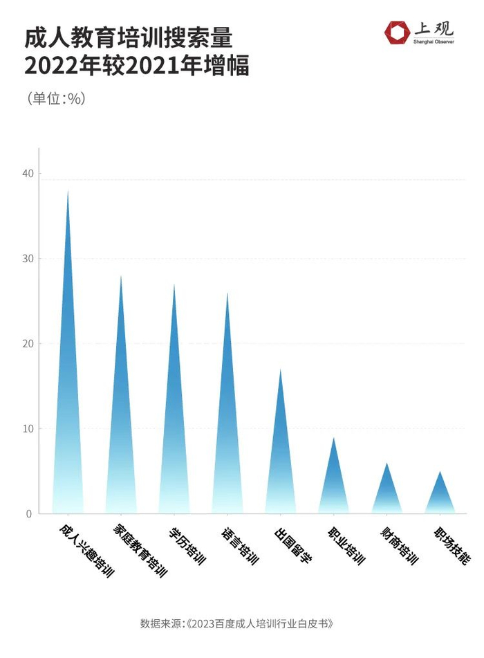 其中,成人兴趣培训的搜索量同比增速最快,达到38%。相比之下,属于传统成人教育的职业培训,增幅仅为9%。