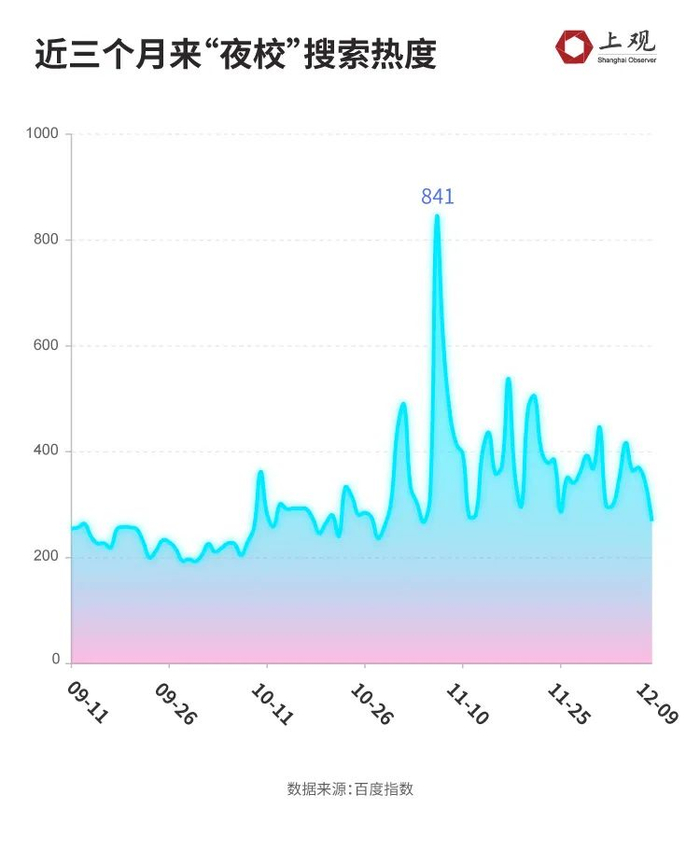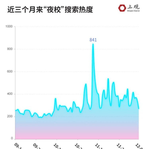 百度指数显示,近三个月来,“夜校”的日均搜索指数高于300,同比增长22%,一度达到峰值841。