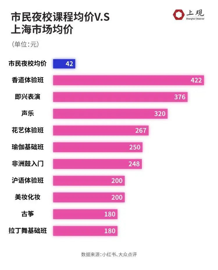 上海市民夜校几乎所有课程的价格,都是500元12节课。在热门微博话题“年轻人为什么抢着上夜校”下方,便有网友感叹“500块?我也去!这也太便宜了”,而该话题下的600多条评论中,“便宜”一词被提及的频率最高,共有28次。