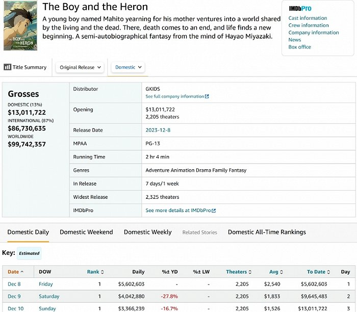 据The-Numbers统计,《苍鹭与少年》在提前场便进账239万美元,超过前一周的《哥斯拉-1.0》(210万美元)。