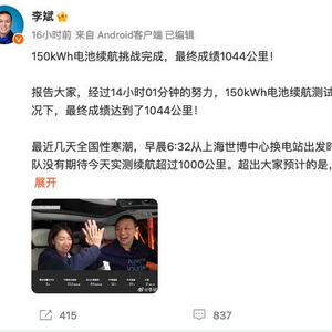 最终,李斌驾车经过14小时01分钟,这块150kWh电池续航测试在还剩3%电量的情况下,最终成绩达到了1044公里,完成了直播挑战。
