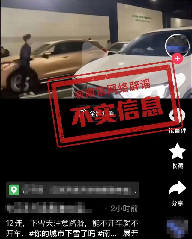 “南京网络辟谣”微信公众号发文称,12月18日,南京普降大雪,网上流传一条关于“过江隧道多辆汽车连环追尾”的视频,并以此提醒网民“下雪天注意路滑”“能不开车就不开车”,引起不少网民询问具体事发地点并关注现场情况。经向公安部门核实,视频中的事故发生在2021年4月1日南京江山大街隧道内。截至今日发稿前,南京市隧道内暂未发生较大交通事故。