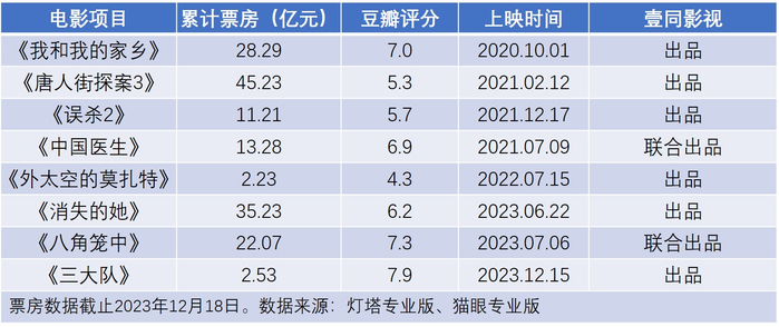 在具体项目中,壹同影视出品的6部电影中,万达电影参与了5部。除了联合出品《我和我的家乡》以外,万达电影在《唐人街探案3》《误杀2》《外太空的莫扎特》和《三大队》中都是出品方。而与壹同影视共同担任出品方的电影项目,几乎是万达电影2020年以来历年票房最高的项目。万达电影2023年在内容板块式微,已上映的主控项目《宇宙探索编辑部》《倒数说爱你》《申纪兰》票房均未破亿,正在上映的《三大队》也是今年万达电影内容板块最后的希望。