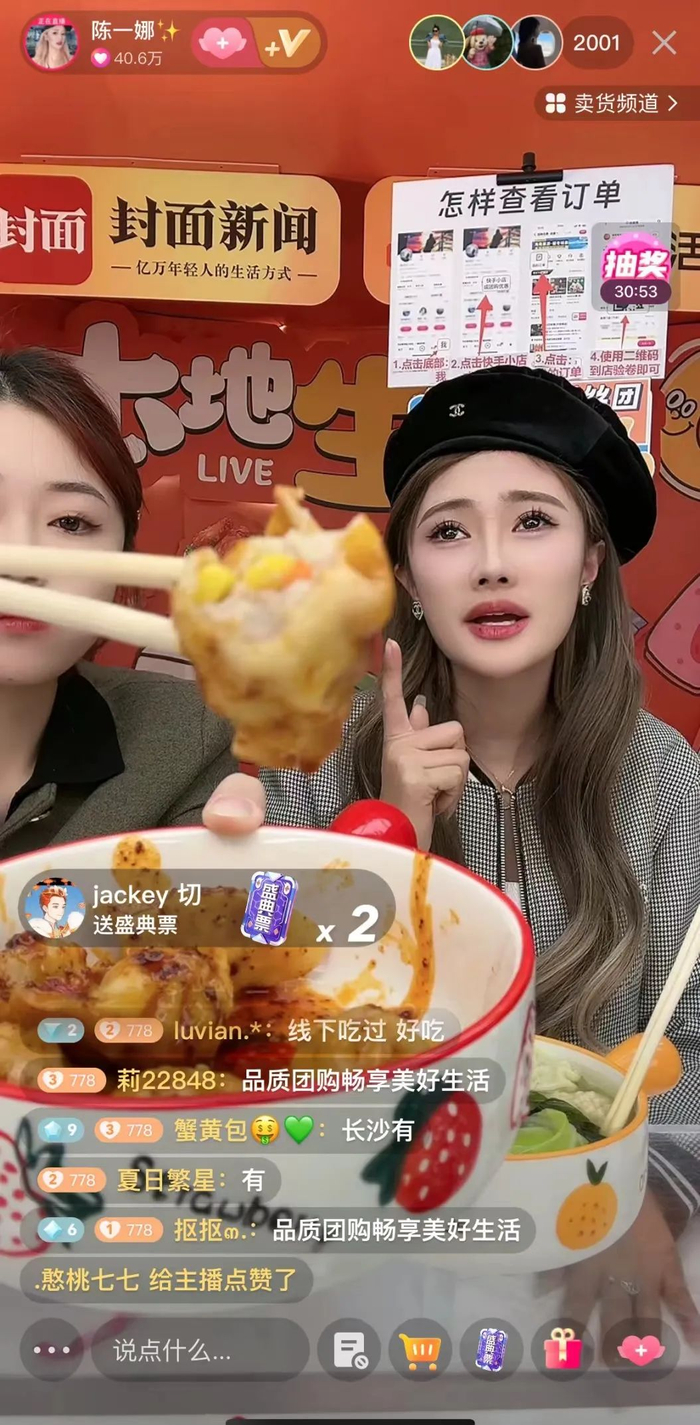 直播以“美食盛宴”开场,多款物美价优的美食团购券让观众们应接不暇。“老铁们看看这皮薄馅儿大的水饺,还送你海鲜汤料包、辣椒包等配料,简单烹饪,健康营养又美味。”拥有2306万快手粉丝的陈一娜在直播间表示来自广州的她更喜欢吃海鲜汤汁的馄饨,来自四川的封面新闻主播文怡则介绍自己更爱麻辣干拌,分享美食偏好的同时,两人在直播间上演起“吃播”。18.7元一盒袁记云饺、8块钱一杯的一只酸奶牛、24.6元的享哆味汉堡炸鸡套餐......让屏幕前的吃货们边流口水边下单。