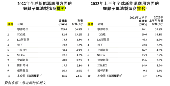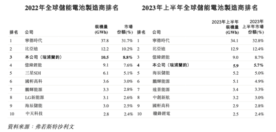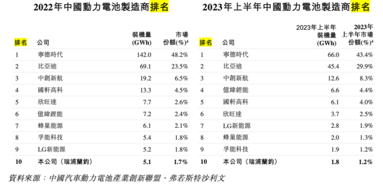 2022年、2023年上半年,瑞浦兰钧在全球储能电池装机量排行榜中,排名从第三名滑落至第四,市场份额从8.8%下滑至5.7%,行业第三的位子被亿纬锂能取而代之;在中国动力电池装机量均排名第十,市场份额则从1.7%跌至1.2%;在全球锂离子电池制造商中排名第十,市占率由2.5%下滑至1.9%。
