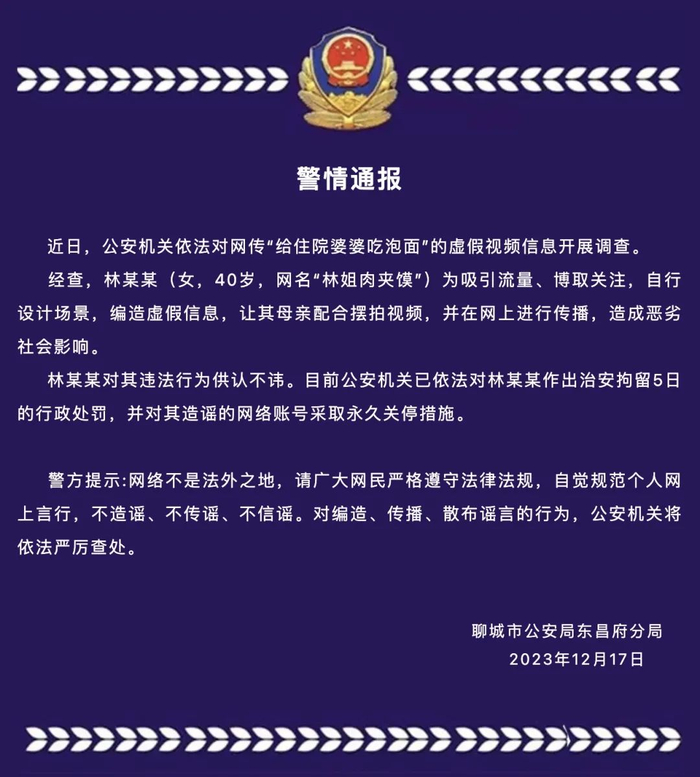 前几天,视频博主“林姐肉夹馍”发布多条“给住院婆婆吃泡面”的视频,引发网络关注。之后,该博主发视频主动承认画面系摆拍,住院老人其实是亲妈,摆拍视频是为了涨粉。