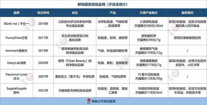 据青眼不完全梳理发现,诸如blankme半分一、Funny Elves方里、Dewy Lab淂意等专注于底妆的品牌,正异军突起。比如,2022年,Funny Elves方里获得贝泰妮数千万元领投。
