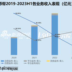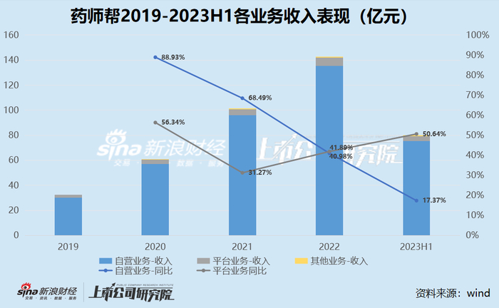 需要注意的是,药师帮的上述两项业务,均存在着显著特征。其中,自营业务的收入规模与收入占比很高,2020-2023上半年实现营收分别为56.91亿元、95.90亿元、135.19亿元与75.22亿元,每年的整体收入占比在95%上下,是公司业绩的绝对支撑。但与此同时,也是公司整体业绩增速放缓的主要原因,自营业务的收入增长从2020年的88.93%已降低至2023上半年的17.37%。更何况,自营业务一直以来空有规模,且难以拓宽盈利空间,近年来该项业务的毛利率均为个位数,导致公司整体毛利率仅在10%上下。