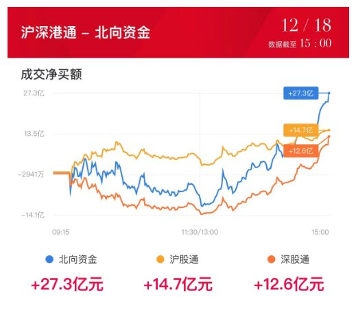 北向资金全天净买入27.27亿,其中沪股通净买入14.7亿元,深股通净买入12.57亿元。