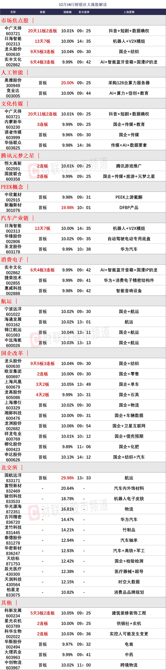 叠加中央经济工作会议和国企三年改革行动的消息,使得市场对于明年国企改革深化提升预期继续升温。不过板块整体活跃的同时,此前领涨的例如四川金顶、南京公用、南京商旅等热门高标出现大面积退潮。上海、湖北等地的低位国资股进一步得到资金挖掘,板块涨停股中名称带龙个股为数不少。结合2023年临近尾声,市场“炒龙”热情回暖的助攻下,资金仍存进一步聚焦“国企龙”的可能。