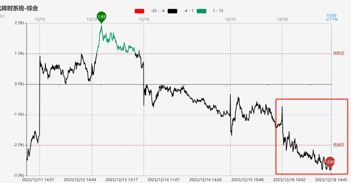 指标显示,今早短线情绪低开于0轴下方后,随着高位股补跌个股的持续增加,拖累短线情绪持续展开震荡探底。午后随着指数的持续扩大跌幅,短线情绪维持弱势震荡,最终报收于低迷区下方。