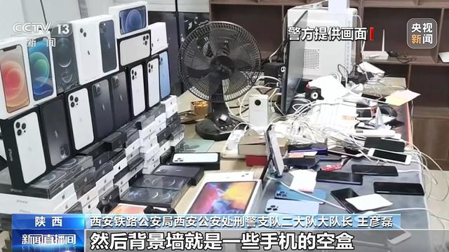 西安铁路公安局西安公安处刑警支队民警 王彦磊:现场就一个小房间,然后架的很多部手机,背景墙就是一些手机的空盒、平板电脑的空盒,用来装饰用的。