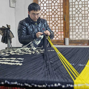 传统纺丝、图案设计、分捆扎染、上机织绸……走进新疆和田市吉亚乡吉亚丽人艾德莱斯丝绸有限责任公司,匠人们正展示着艾德莱斯绸的制作。