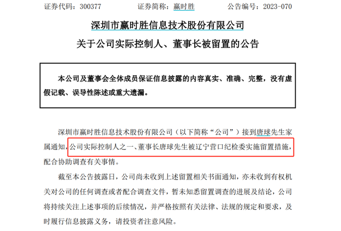 赢时胜董事长被留置12月18日,赢时胜发布公告称,公司收到唐球家属通知,公司实际控制人之一、董事长唐球被辽宁营口纪检委实施留置措施,配合协助调查有关事情。