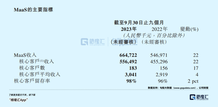 华泰证券指出,凭借深刻的数据洞察、不断优化的分析模型、扎实的金融机构客户基础,公司MaaS业务有望维持先发优势,实现核心客户数量和平均收入的稳定增长。根据三季报,今年前三季度百融云的MaaS业务核心客户留存率达98%,同比提升2个百分点;核心客户数183家,同比增加17%;核心客户平均收入304万元,同比增长4%。积极的运营数据,背后反映的是多元解决方案的渗透率提升、与客户合作关系的深化,以及用户调用量的提升。