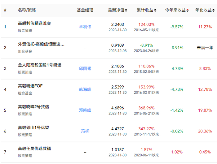 据私募排排网数据显示,高毅资产仅公开了7只产品收益率,“草根大神”冯柳管理的高毅邻山1号远望年化收益率高达20.36%,前博时明星基金经理邓晓峰管理的高毅晓峰2号致信年化收益率同样接近20%。