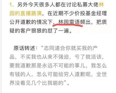 相较于但斌的让利,同样网红出身的林园处理方式却较为强硬。在2021年一场路演时,面对投资人的质问林园不仅拒不道歉,还怒怼投资人,“志同道合你就买我的产品,不买我的也从来不强迫。亏了就活该,要我道歉那是永远不可能的事儿,我这么有钱的人,怎么可能给穷人道歉呢?全世界没看见几个比我能的”