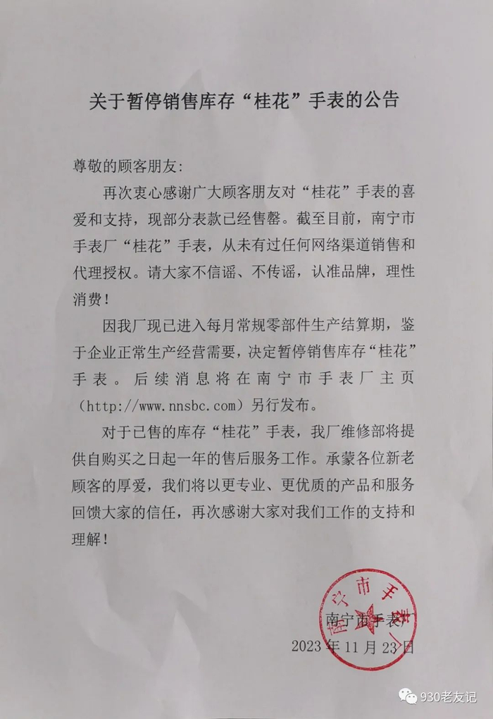 在2023年11月,经过社交平台的裂变式传播,由南宁市手表厂在上世纪90年代生产的桂花牌手表一夜跻身本地“顶流”。为了购买一块桂花表,手表厂门口的门市部前排起了超过1公里的长龙,厂家不得不临时出台限购措施、呼吁理性消费,而这一场愈演愈烈的“抢购”,在11月23日南宁市手表厂发布了一则“关于暂停销售库存‘桂花’手表的公告”之后戛然而止。