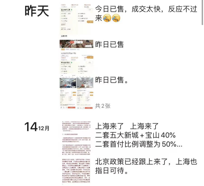二手房方面,“今日已售,成交太快,反应不过来。”12月18日,上海中原地产某门店店长姜平在朋友圈里发布了一条成交信息,并写下了自己的感受。