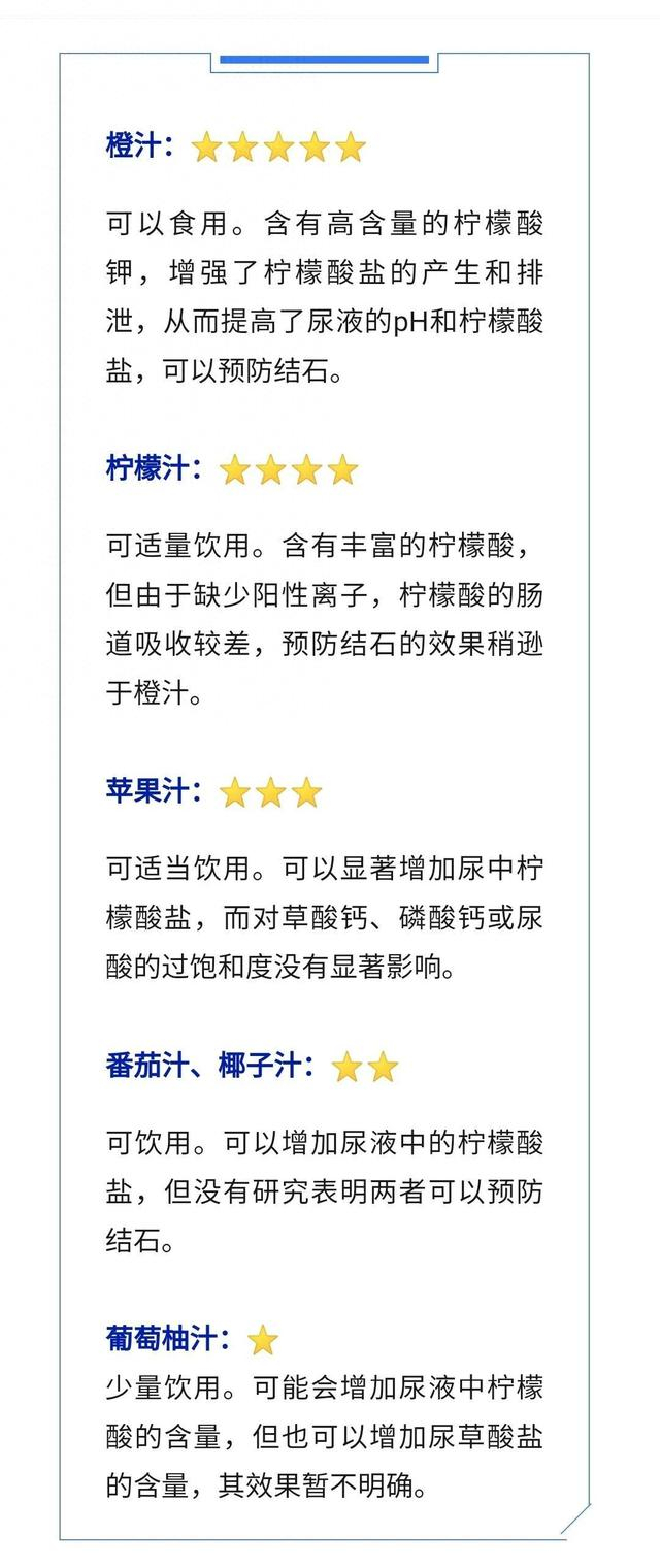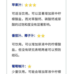 果汁太甜,肯定不行?其实不然!水果和蔬菜天然具有较高的柠檬酸盐含量,柠檬酸盐与尿液中的钙结合,减少尿液中的离子钙,降低钙盐的过饱和度。且柠檬酸盐可以抑制草酸钙和磷酸钙晶体的生长和聚集,可以预防结石生成。
