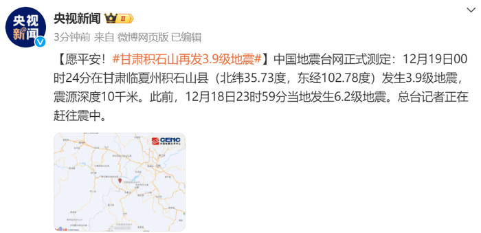 中国地震台网正式测定:12月19日00时24分在甘肃临夏州积石山县(北纬35.73度,东经102.78度)发生3.9级地震,震源深度10千米。此前,12月18日23时59分当地发生6.2级地震。总台记者正在赶往震中。