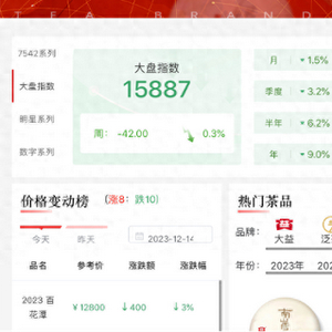 以某找茶平台为例,其首页中不仅清晰列明茶叶的大盘指数,还有细分板块的实时热度指数。而在具体茶品中,不仅会列明价格走势、参考报价、撮合买卖、涨跌排行榜,同时还可以购买“散片”(茶叶术语,每片重357克)。该平台自身也可提供鉴定、买卖服务,买卖范围覆盖多款热门茶品。