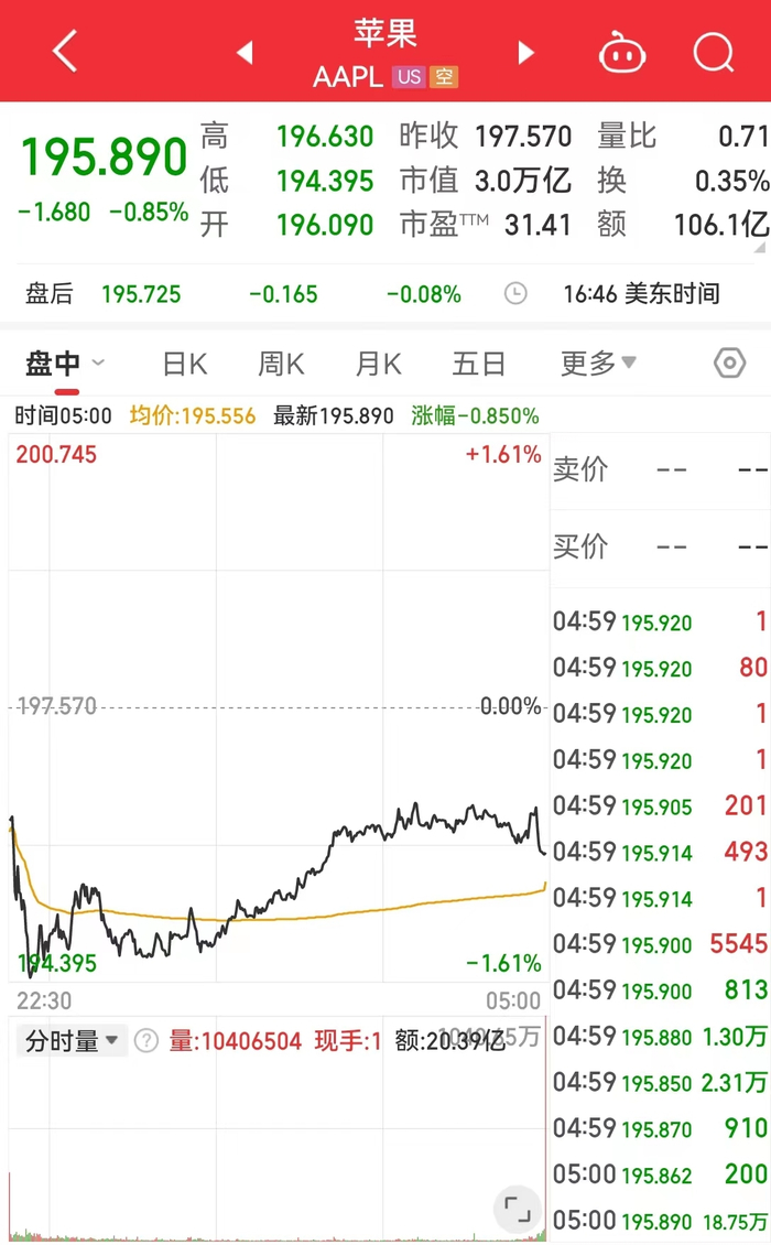 截至当地时间12月18日美股收盘,苹果报195.89美元,跌幅0.85%,市值3.0万亿美元。
