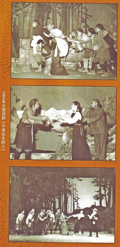1963年,西藏话剧团正在北京八一电影制片厂参加电影《农奴》的后期剪辑工作,北京军区战友文工团编剧王颖将自己撰写的剧本《不准出生的人》交给剧团领导。刚刚从上海戏剧学院毕业的第一批藏族表演班学员们看完剧本都很兴奋,这是继《农奴》后又一部反映西藏民主改革前后农奴真实生活的艺术作品,大家共同将其翻译为藏语版剧本,并决定由话剧团向东和权玉静担任导演。扮演主人公扎西的演员大旺堆自小在庄园里做奴隶,少年时逃到哲蚌寺出家当下等僧人,他曾说“演这些人的感觉就像是真实的自己”。扮演管家的演员索朗绕登也是自小就在拉萨贵族家里当佣人,因不堪忍受凌辱,20岁时就参加了革命,主演的这些苦难的生活经历让他们在塑造角色时有足够的生活体验感和人物质感。经过几个月的认真排练,1963年底《不准出生的人》在八一电影制片厂的礼堂里首演,当时的舞台非常简陋,不似今天这般精巧,但也别有一番味道。舞台被设计成类似苏联油画效果的风格,景片都是薄的,舞台深处有剪影的效果,台口区域用浮雕造型、带笔触的油画效果着色,演出获得了观众的高度认可与热烈反响。1964年春节期间,在北京民族文化宫,再次上演了这部话剧,由于这两次演出是藏语版本,现场观众需要戴着耳机听配音了解剧情,但这并不妨碍观众对这部戏的理解和喜爱。当时周总理观看演出后特意到舞台上向演员表示慰问,演员们都感到很幸福,这是继《文成公主》演出后再一次和周总理握手留念。