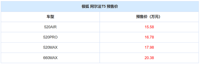 汽车之家获悉,极狐阿尔法T5将于12月27日正式上市。此前新车已经开始预售,共推出4款车型,预售价区间为15.58-20.38万元。该车定位为纯电中型SUV,整体尺寸略小于极狐 阿尔法T(ARCFOX αT)。新车可提供800V快充,可实现10min补能260km;续航方面则提供520km/660km两种续航版本。