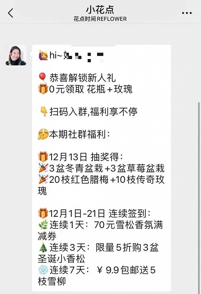 花点时间也在竭尽全力地挤入这场价格战。比如他们公众号最新推送的头条是“9.9元=3盆雪顶草莓+3盆冬青”。但当你被这个标题吸引进去之后,会发现这个价格需要进群抽奖,名额有限。其他优惠也绝非唾手可得,比如9.9元的5枝雪柳,需要连续签到7天。