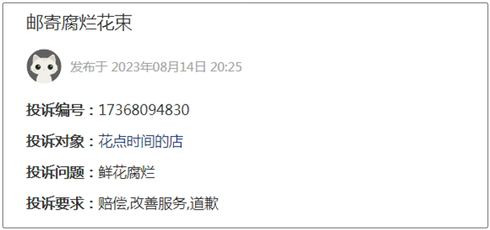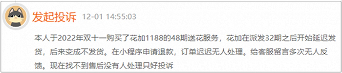 此外,还有不少网友投诉花点时间延迟发货、花束质量差等问题。