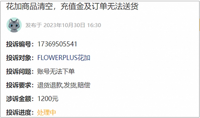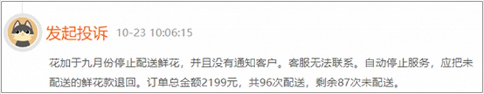 用户密集投诉,并在社交平台纷纷发声,让“花加倒闭”的猜测甚嚣尘上。