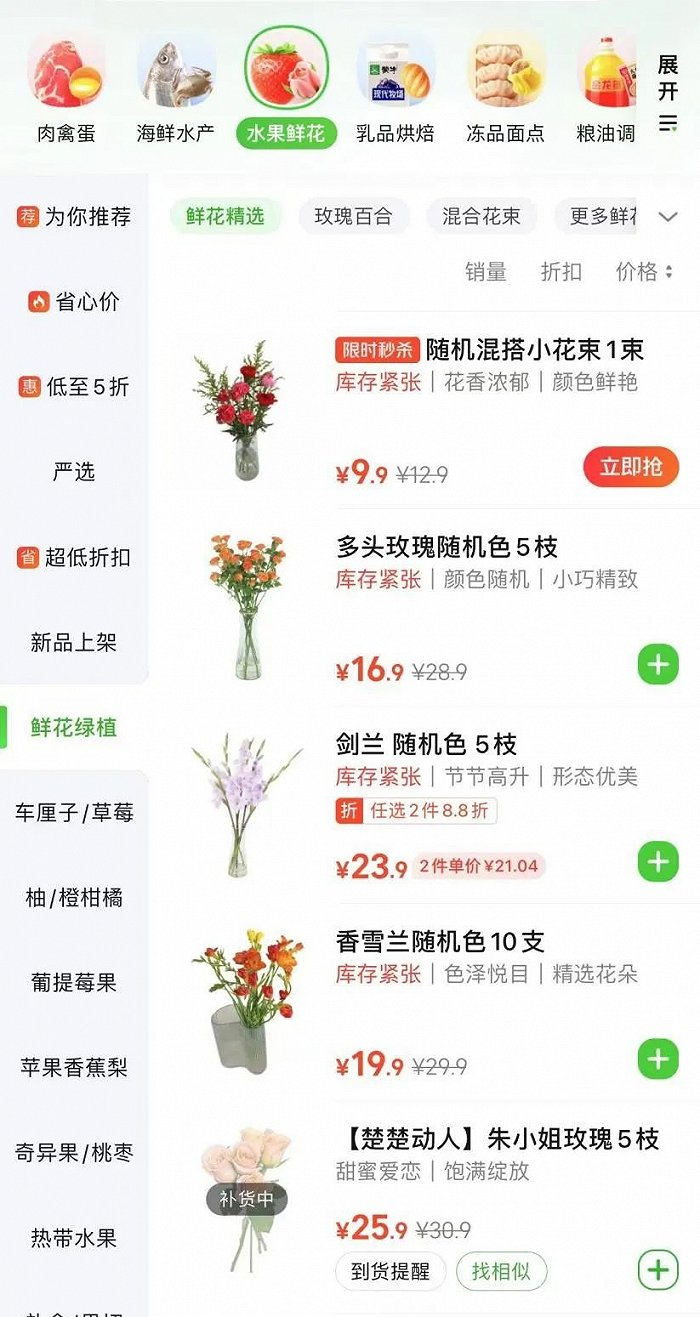 近两年很多“互联网买菜人”发现,生鲜平台上突然出现价廉物美的鲜花,不到10元钱就能买到一束花。美团和盒马的鲜花不仅便宜,配送速度还更快,基本上半小时到1小时就可以送达。而且生鲜平台的售后服务更便捷,用户对花材不满意,拍照提交就可以迅速退换。这是因为生鲜平台本来就有超强的冷链运输,冷库也更大更先进,其终端配送也早已打通“最后一公里”,对他们来说,卖花无非是给饭桌加双筷子,捎带手就干了。